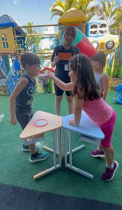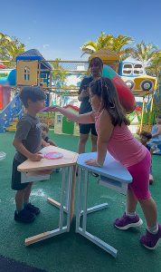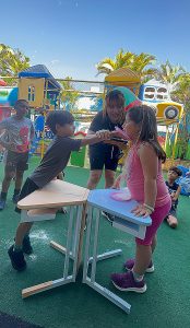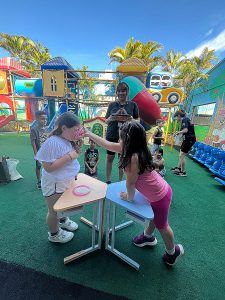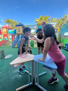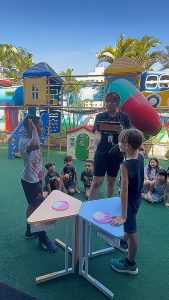 A atividade da torta na cara não utilizou torta nem chantilly, sendo realizada apenas com farinha de trigo.