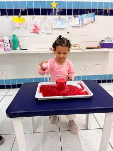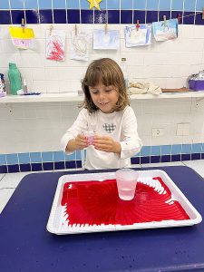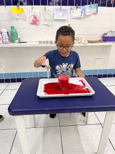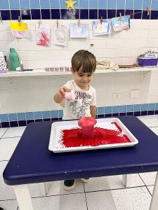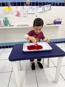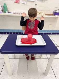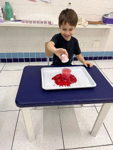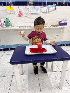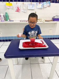 Fizemos uma experiência com as crianças, onde elas colocaram um líquido “misterioso” em um copo com água e bicarbonato de sódio (que era vinagre com corante vermelho), e antes foi contada uma história que contava como era esse planeta e como a lava aparecia.