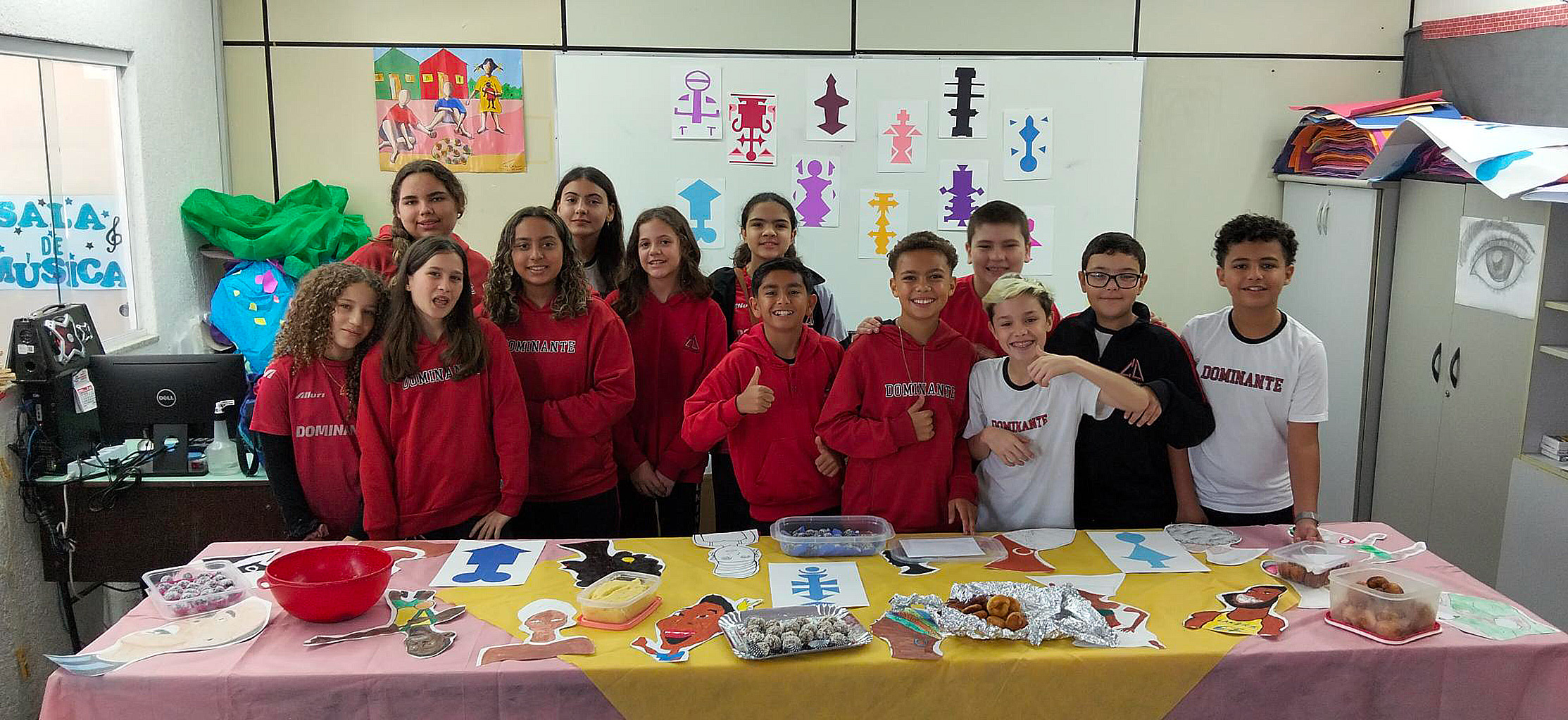A decoração da mesa foi proposta com base nos trabalhos feitos pelas turmas do Fundamental 2, sendo compostas por releituras da obra de Rubem Valentim e caricaturas de personalidades negras.